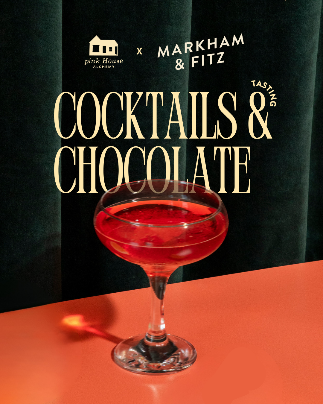Enjoy an evening of curated cocktails by PinkHouse Alchemy thoughtfully paired with craft chocolate from Markham & Fitz. Must be 21 to participate.