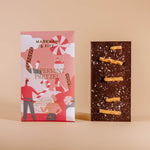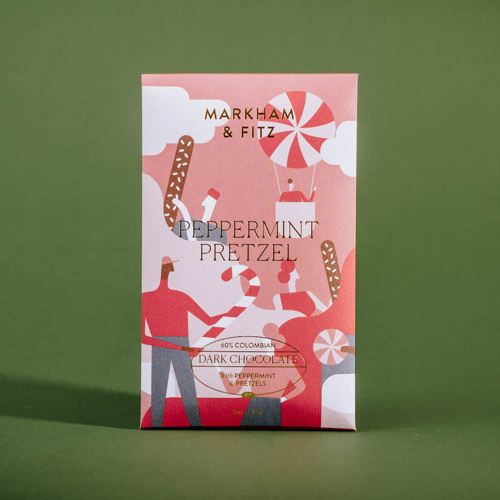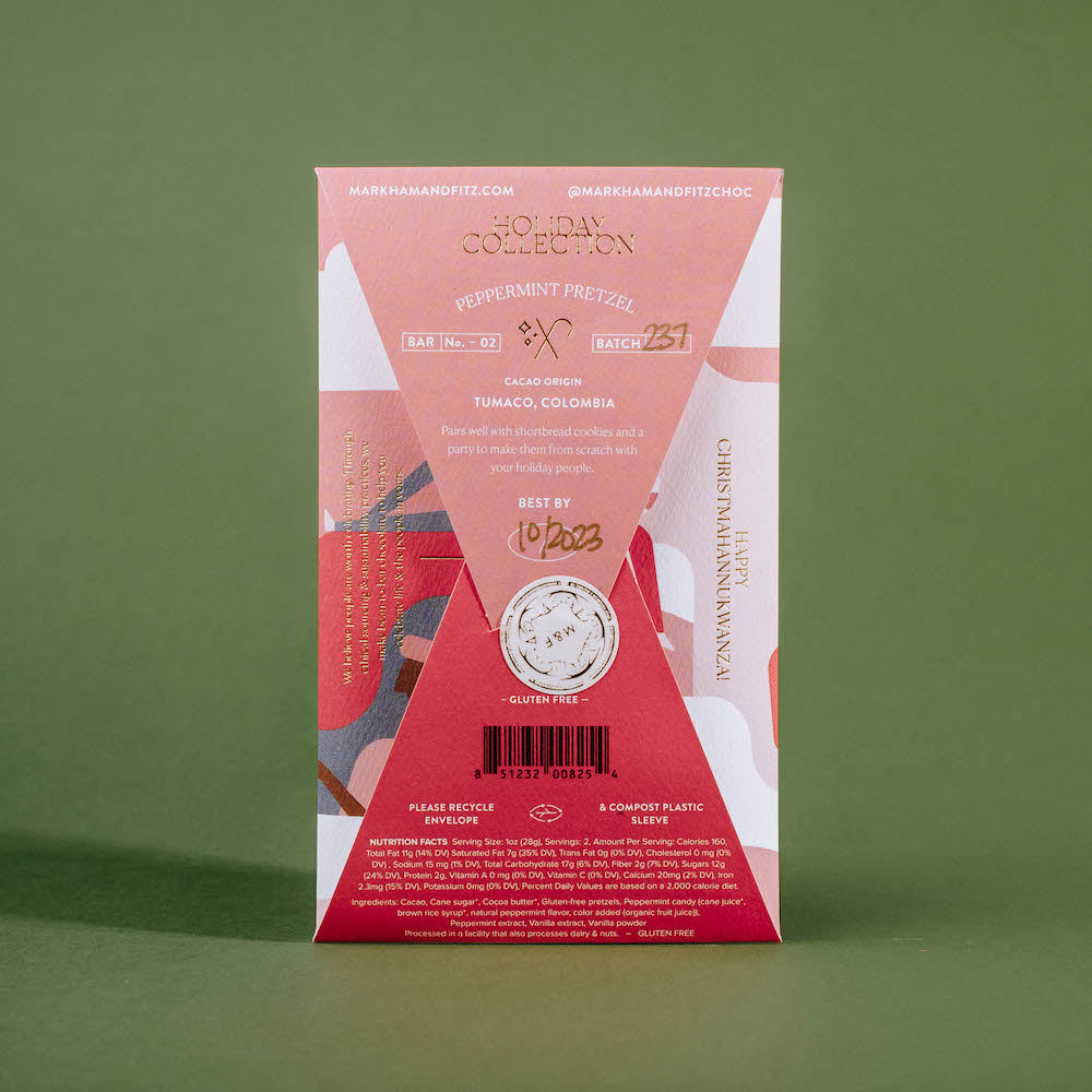 60% Colombian dark chocolate infused with peppermint oil, sprinkled with peppermint candy and pretzels (GF). A nod to a household favorite, chocolate covered pretzels.